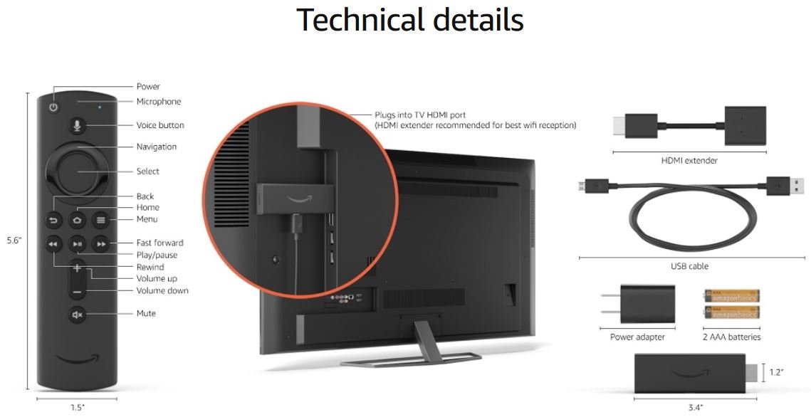 Included in the box | Fire TV Stick (3rd Gen), Alexa Voice Remote 2nd Gen, USB cable and power adapter, HDMI extender, 2 AAA batteries, Quick Start Guide |