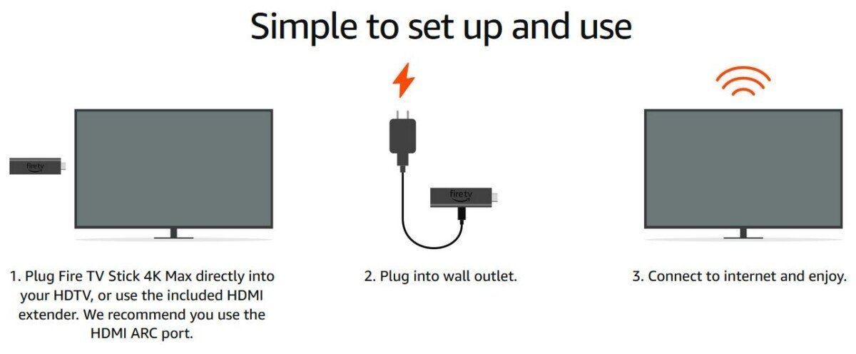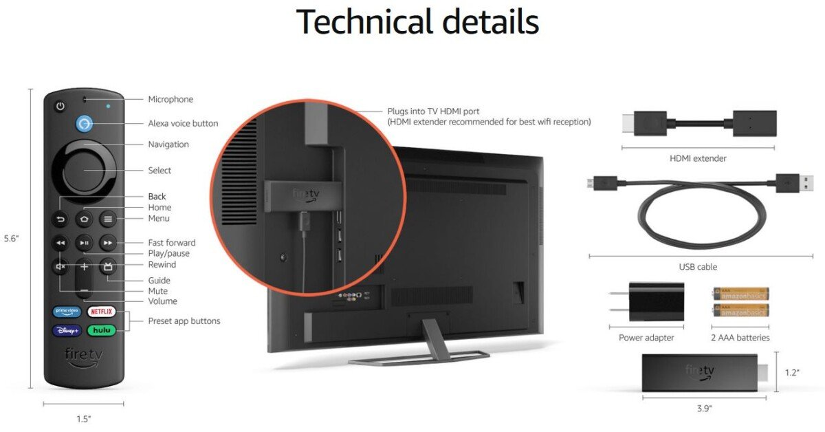 Included in the box | Fire TV Stick 4K Max, Alexa Voice Remote (3rd Gen), USB cable and power adapter, HDMI extender cable for Fire TV Stick 4K Max, 2 AAA batteries. |